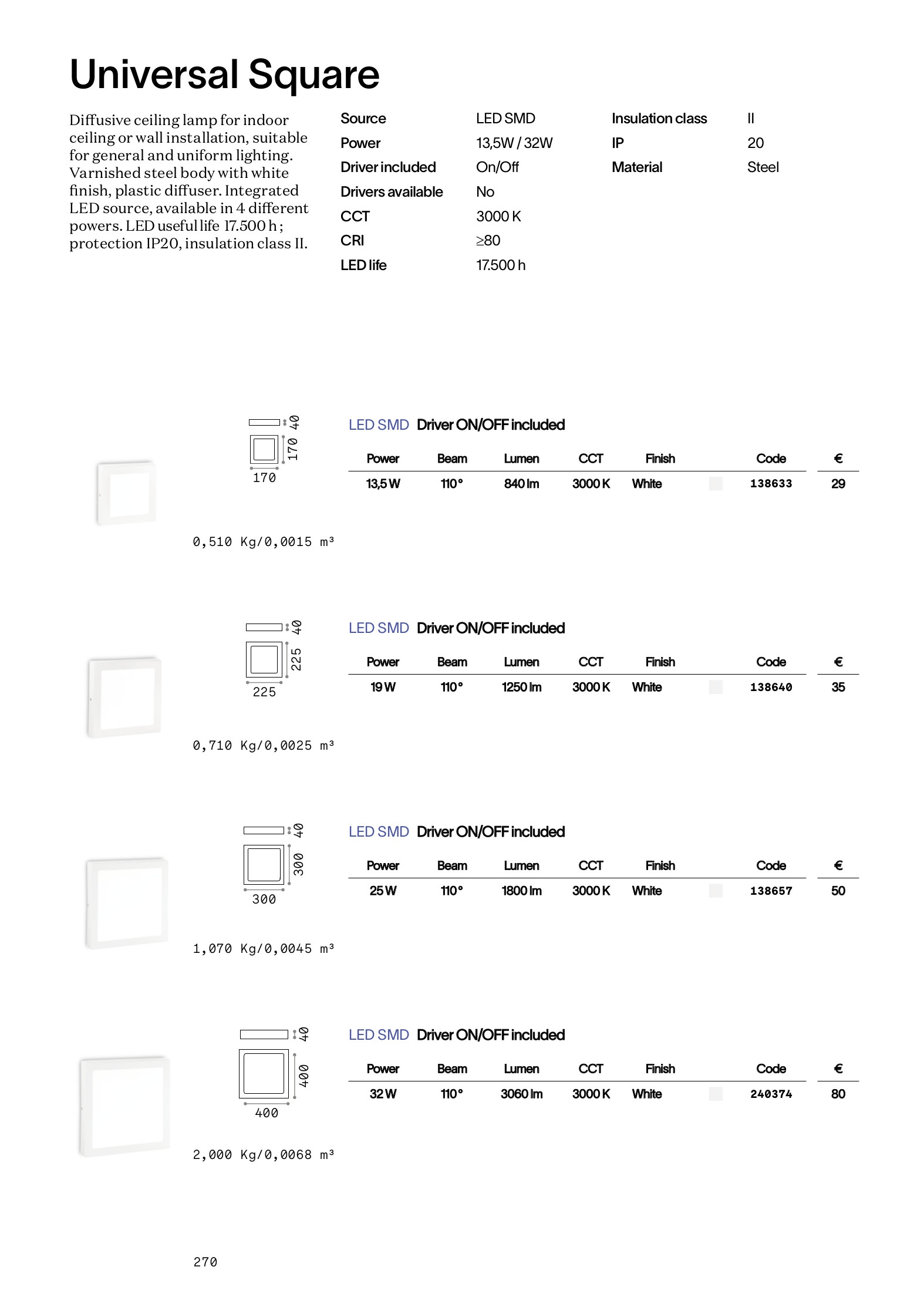 Лед плафон UNIVERSAL PL D40 SQUARE ще осигури комфорт и естетика във всяко помещение, в което се постави. Цялостната визия и дизайн на led лампата и вложените в изработката й материали, като лакирана стомана с бяло покритие, дифузер от полимер в бяло, ще допринесат за един неповторим стил. Благодарение на дългогодишния опит в производството на лед осветление, качествените материали и строгия контрол на качеството на изработка на производителя Ideal-Lux (Италия), UNIVERSAL PL D40 SQUARE е на високо европейско ниво.