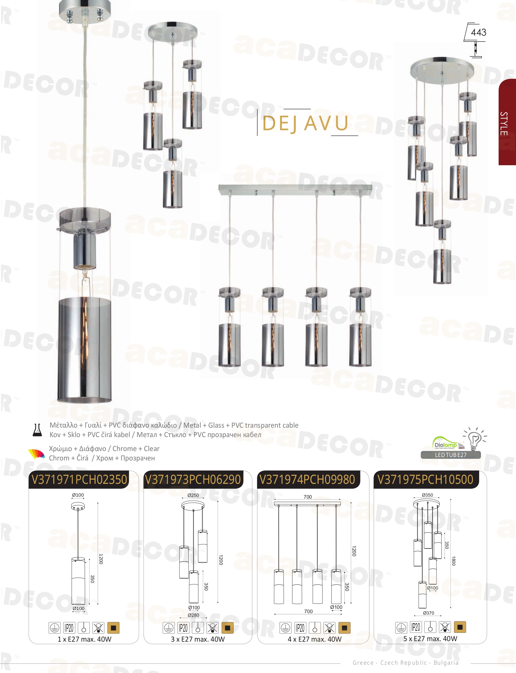 Осветителното тяло V371975PCH ще осигури комфорт и естетика във всяко помещение, в което се постави. Цялостната визия и дизайн на лампата и вложените в изработката й материали, като метал в цвят хром, частично хромирано стъкло, PVC прозрачен кабел, ще допринесат за един неповторим стил. Благодарение на дългогодишния опит, качествените материали и строгия контрол на качеството на изработка на производителя ACA-Lighting (Гърция), V371975PCH е на високо европейско ниво.