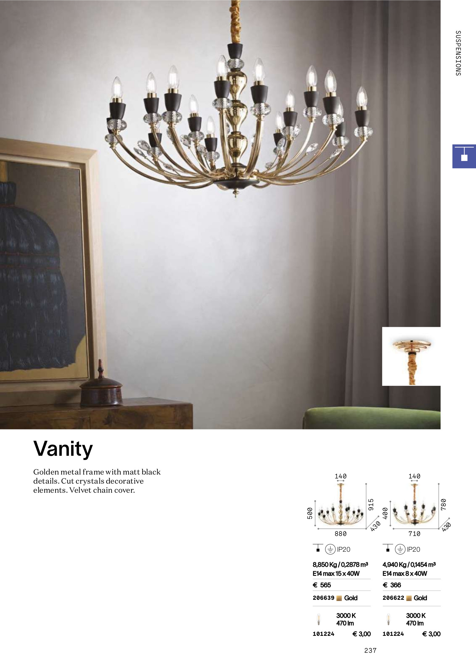 Осветителното тяло VANITY SP8 ще осигури комфорт и естетика във всяко помещение, в което се постави. Цялостната визия и дизайн на лампата и вложените в изработката й материали, като метал в цвят злато, детайли в матово черно, фасетирани кристални елементи, кадифено покритие на веригата, ще допринесат за един неповторим стил. Благодарение на дългогодишния опит, качествените материали и строгия контрол на качеството на изработка на производителя Ideal-Lux (Италия), VANITY SP8 е на високо европейско ниво.