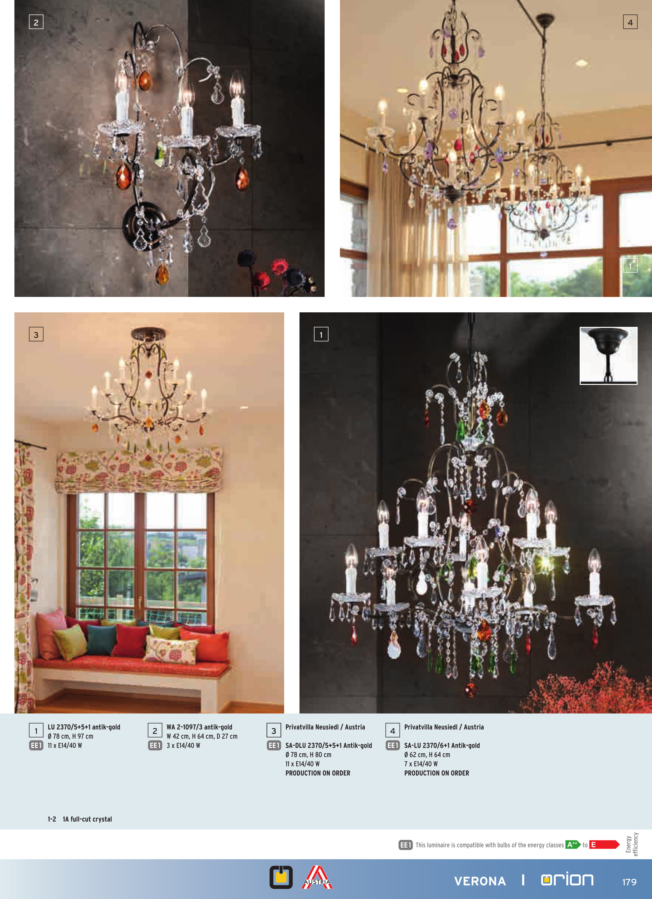 За стила и естетиката на обстановката допринасят, както цялостната визия и дизайн на осветителното тяло, така и вложените в изработката качествени материали, като: стомана в цвят антично злато, прозрачни и цветни фасетирани кристали А1 в стил joie de vivre.