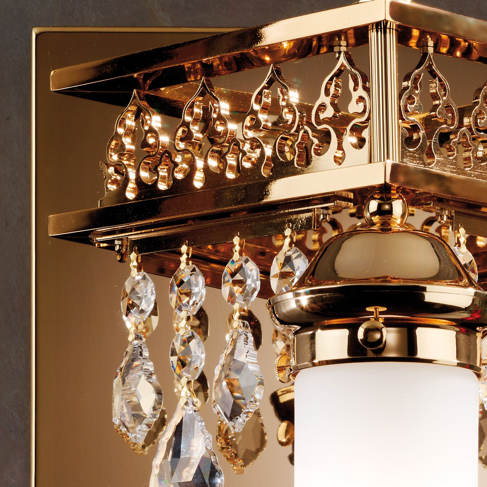 масивен месинг с 24-каратово златно покритие, кристални висулки и кристални призми от SCHÖLER CRYSTAL®, ориенталски дизайн