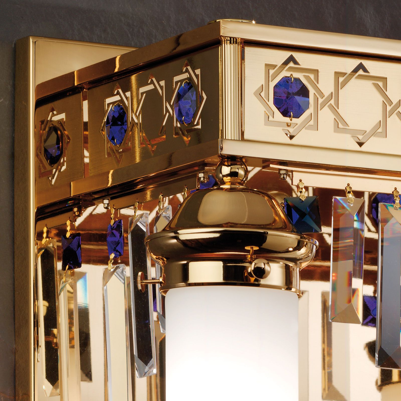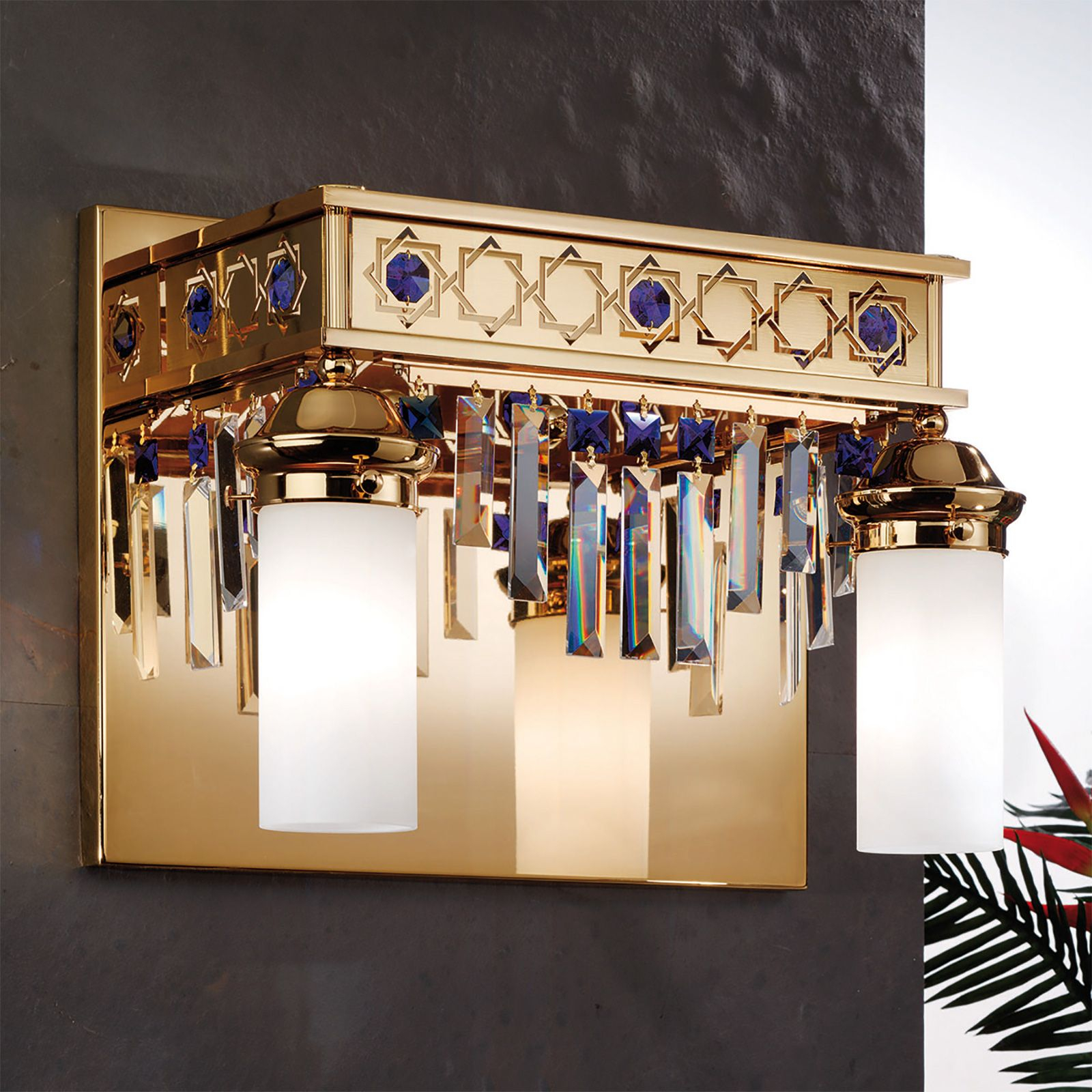 масивен месинг с 24-каратово златно покритие, кристални висулки в син цвят и кристални призми от SCHÖLER CRYSTAL®, ориенталски дизайн