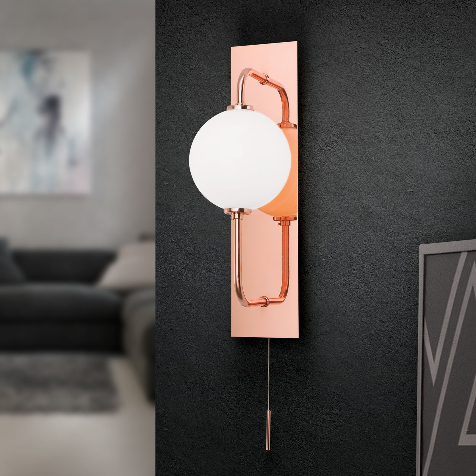 За стила и естетиката на обстановката допринасят, както цялостната визия и дизайн на осветителното тяло, така и вложените в изработката качествени материали, като: масивен месинг в цвят блестяща мед, стъкло в цвят блестящ опал, ключ ON/OFF.