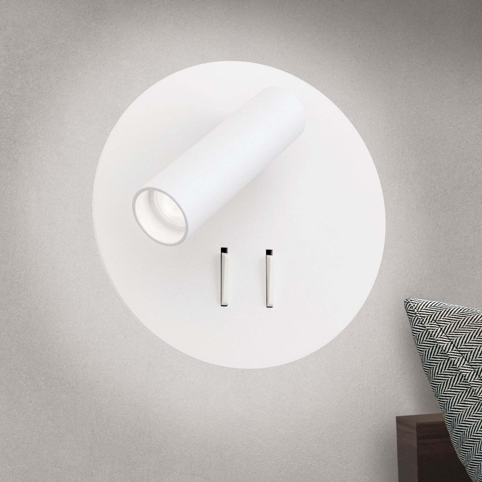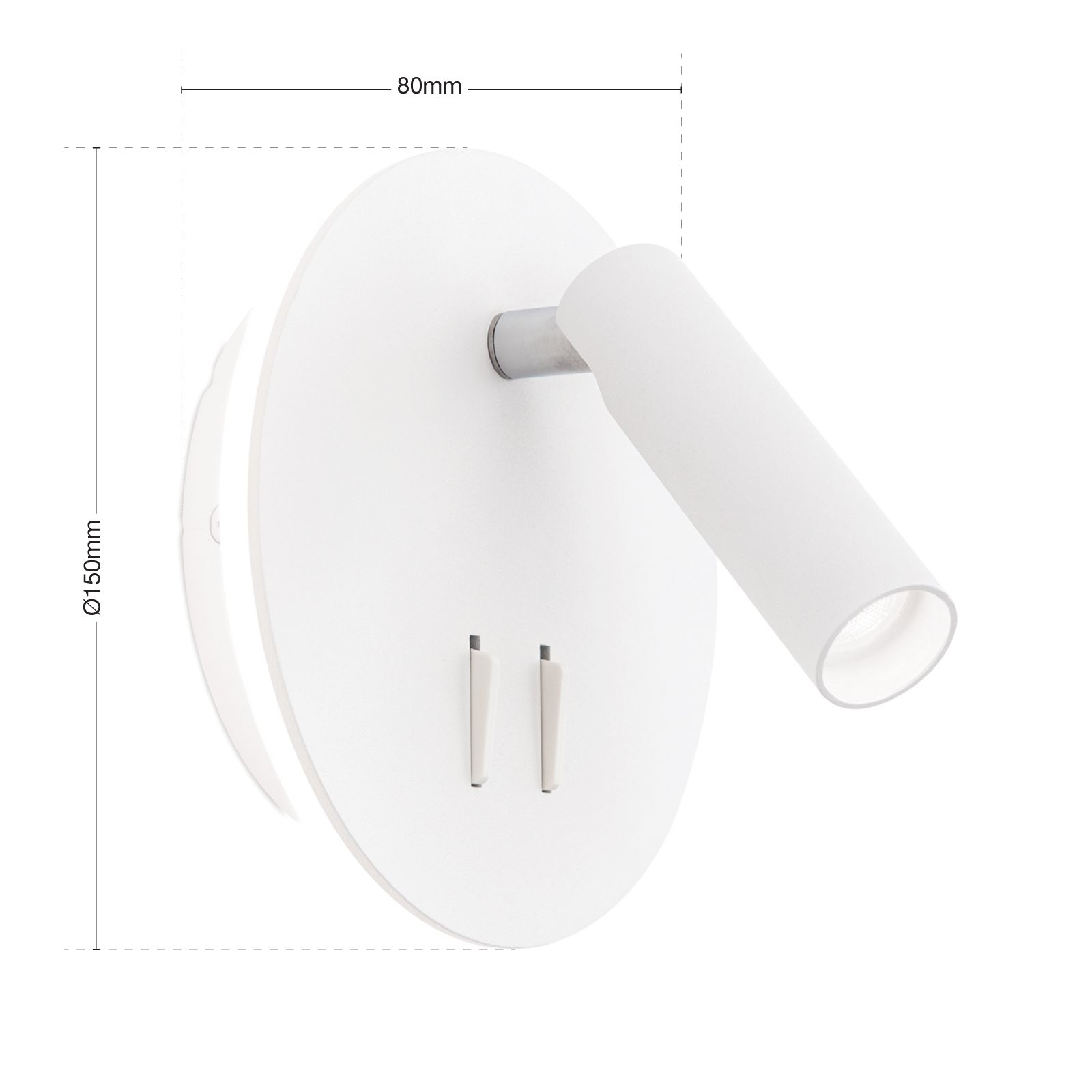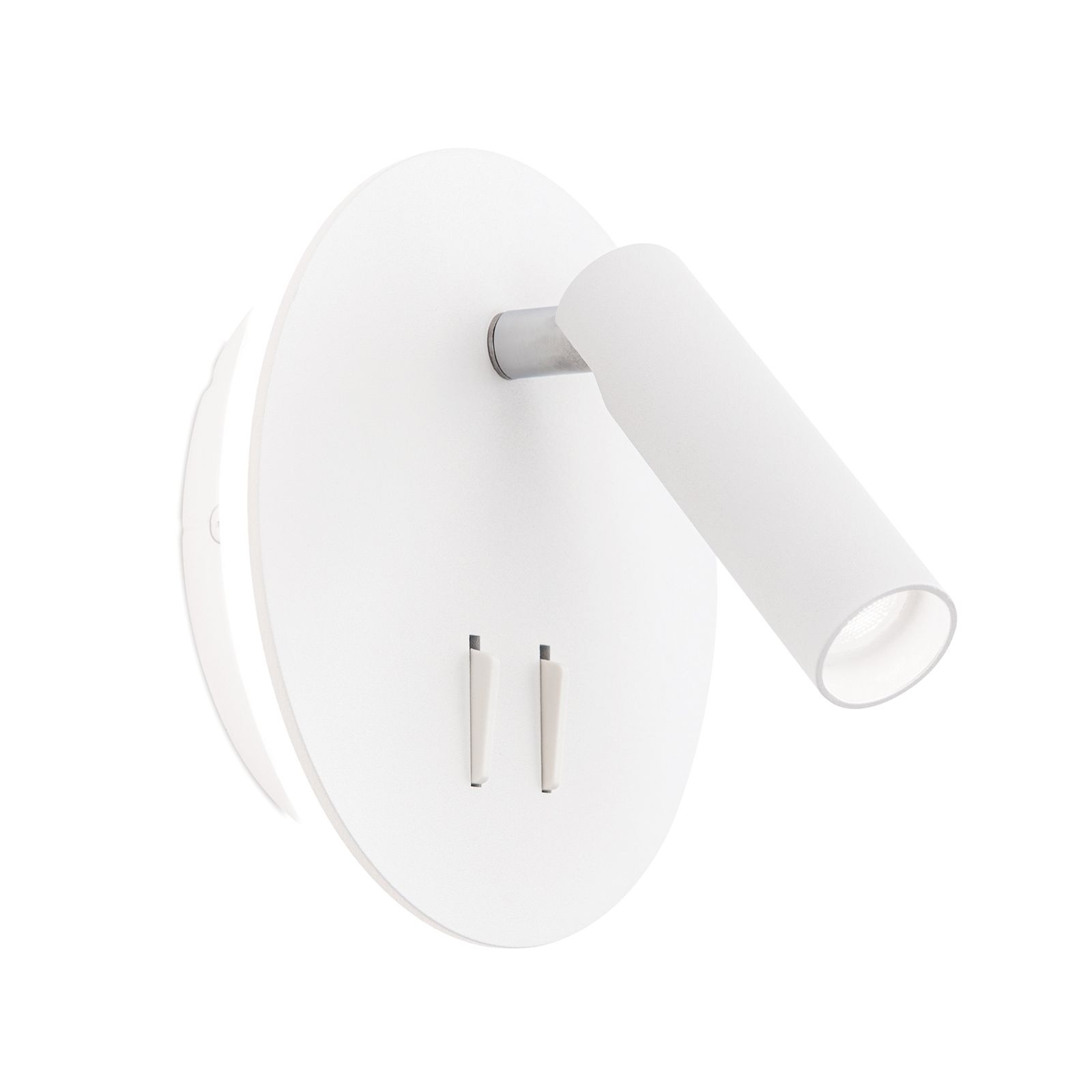 алуминий в бял цвят, светещ пръстен, излъчващ индиректна светлина и насочваща се спот лампа за четене, два превключвателя ON/OFF
