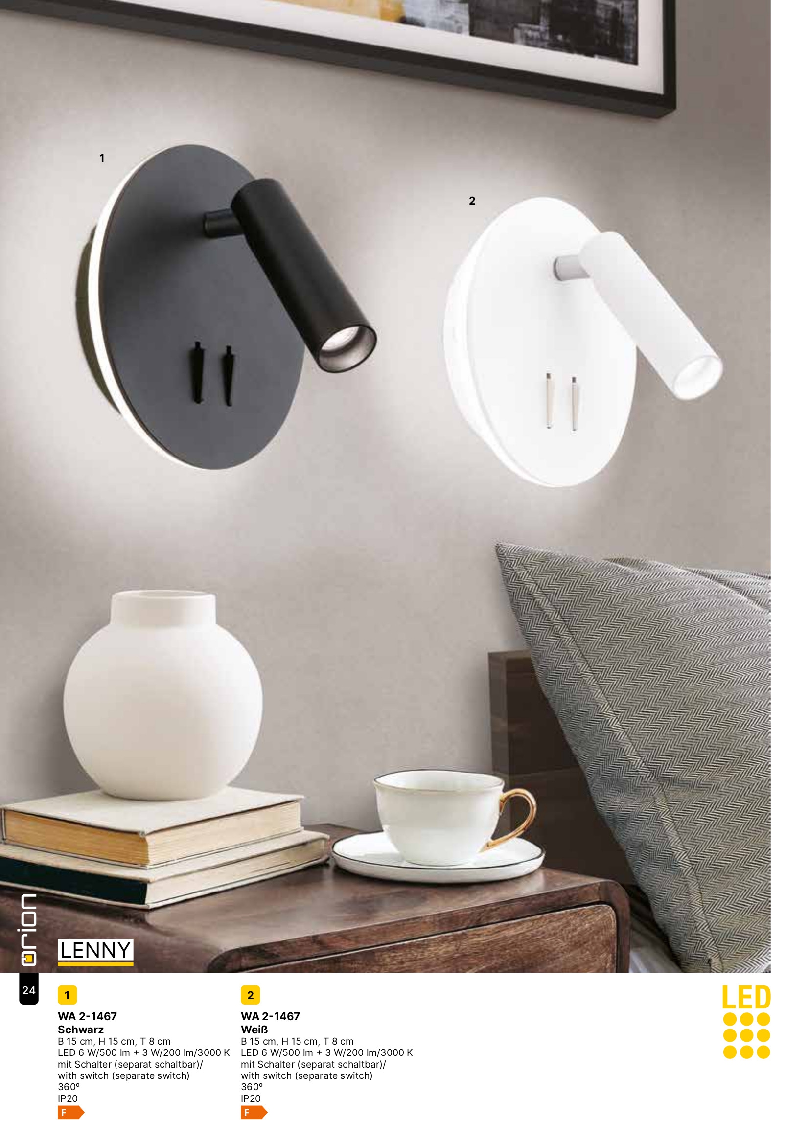 Осветителното тяло WA 2-1467 wei? (LED6+3W/500+200lm/3000 ще осигури комфорт и естетика във всяко помещение, в което се постави. Цялостната визия и дизайн на лампата и вложените в изработката й материали, като алуминий в бял цвят, светещ пръстен, излъчващ индиректна светлина и насочваща се спот лампа за четене, два превключвателя ON/OFF, ще допринесат за един неповторим стил. Благодарение на дългогодишния опит, качествените материали и строгия контрол на качеството на изработка на производителя Orion (Австрия), WA 2-1467 wei? (LED6+3W/500+200lm/3000 е на високо европейско ниво.