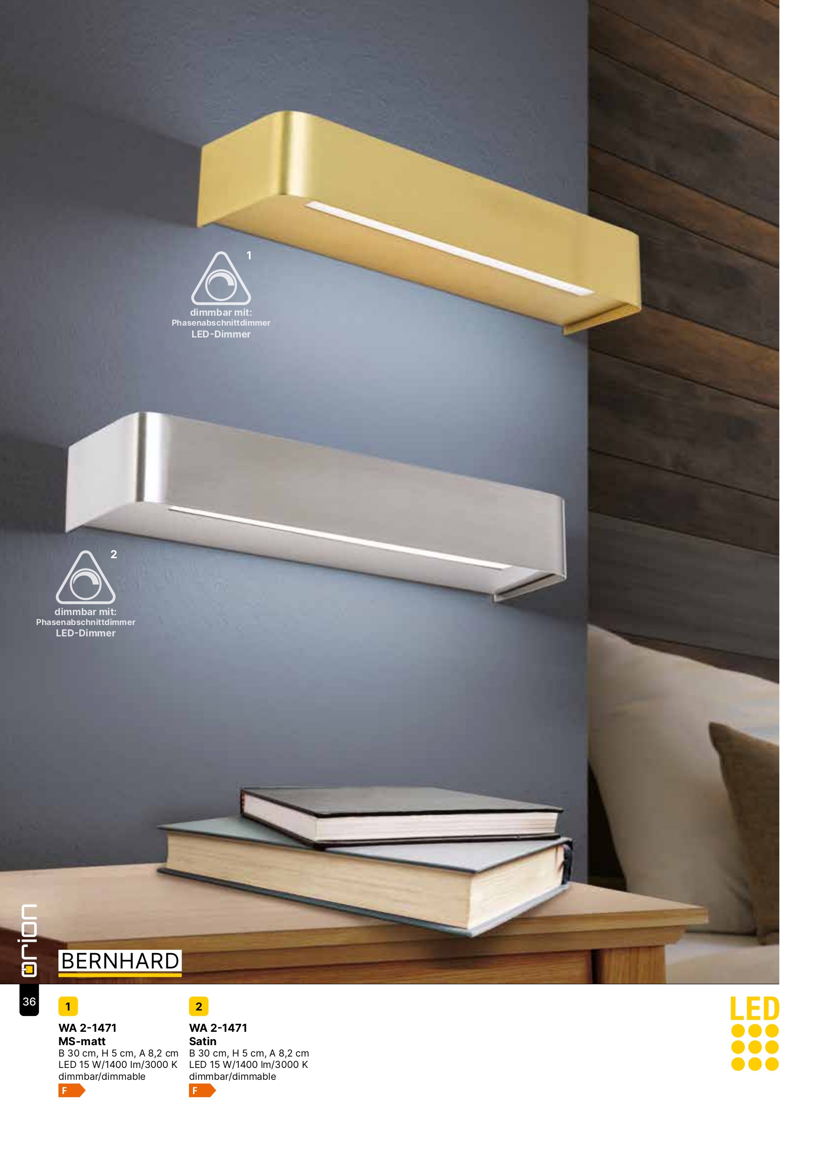 Осветителното тяло WA 2-1471 MS-matt (LED15W/1400lm/3000K) ще осигури комфорт и естетика във всяко помещение, в което се постави. Цялостната визия и дизайн на лампата и вложените в изработката й материали, като стомана в цвят матиран месинг, полимер в цвят мат опал, индиректна димируема светлина, ще допринесат за един неповторим стил. Благодарение на дългогодишния опит, качествените материали и строгия контрол на качеството на изработка на производителя Orion (Австрия), WA 2-1471 MS-matt (LED15W/1400lm/3000K) е на високо европейско ниво.