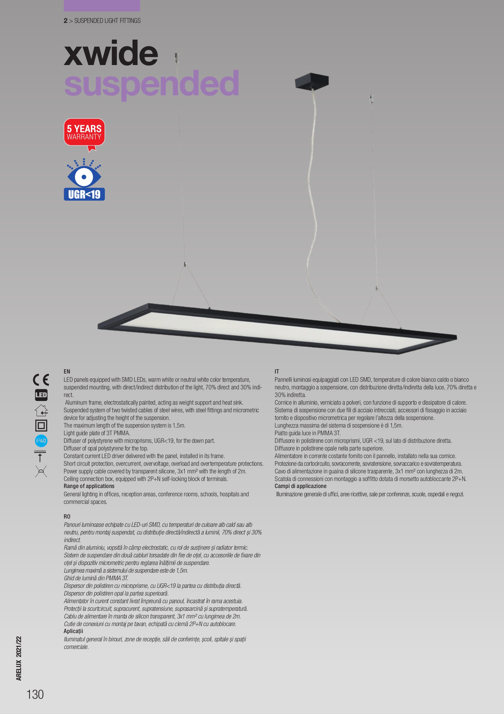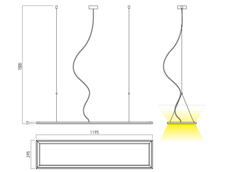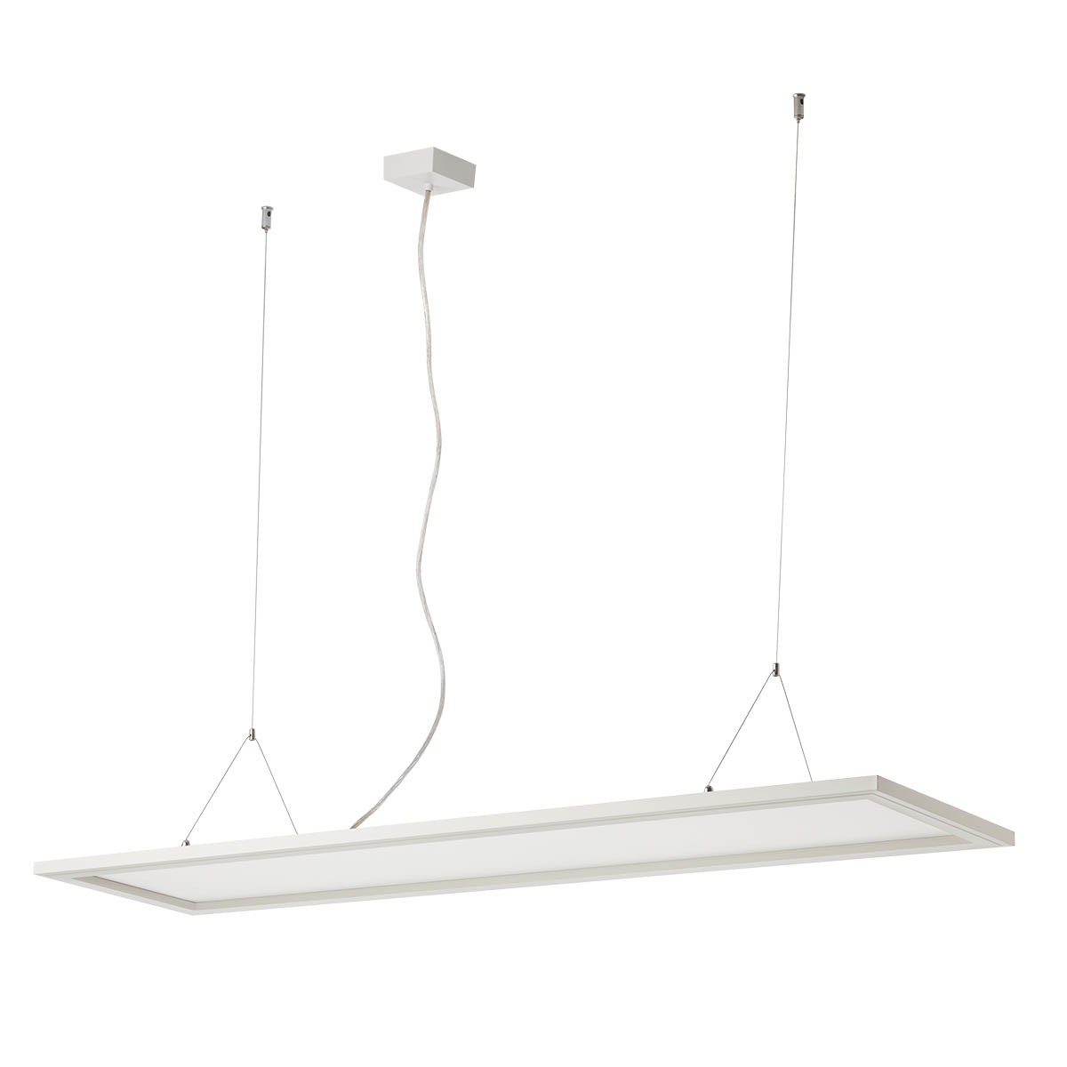 алуминиева рамка в матово бяло, окачване от двойка усукани стоманени телове, стоманени фитиги и устройство за регулиране на окачването, двоен дифузер от полистерен с микропризми 70% директно и 30% индиректно осветяване