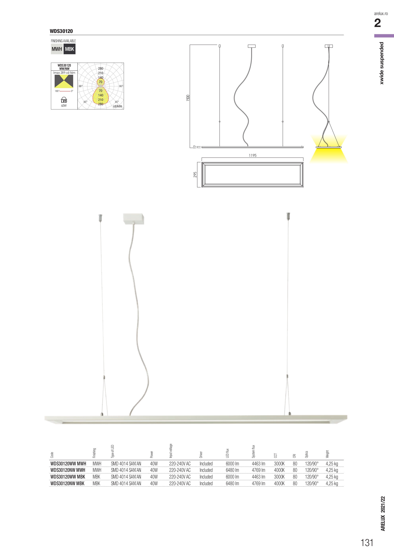 Осветителното тяло WDS30120WW MWH ще осигури комфорт и естетика във всяко помещение, в което се постави. Цялостната визия и дизайн на лампата и вложените в изработката й материали, като алуминиева рамка в матово бяло, окачване от два усукани стоманени телове, стоманени фитиги и устройство за регулиране на окачването, двоен дифузер от полистерен с микропризми 70% директно и 30% индиректно осветяване, ще допринесат за един неповторим стил. Благодарение на дългогодишния опит, качествените материали и строгия контрол на качеството на изработка на дизайнерската линия Redo Arelux на производителя Redo (Румъния), WDS30120WW MWH е на високо европейско ниво.