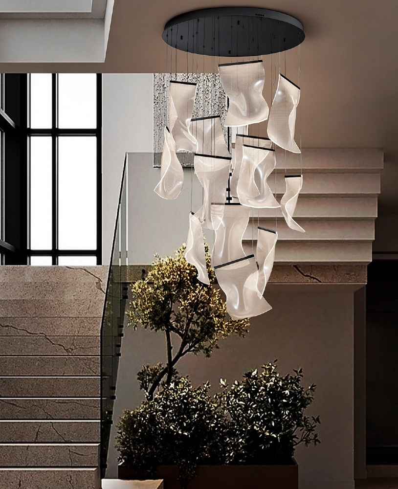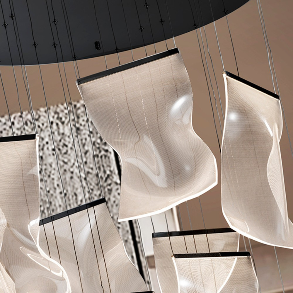 метакрилат под формата на лист с микропечат и метал с матово черно покритие, осветителното тяло съдържа комплект за димиране и дистанционно управление