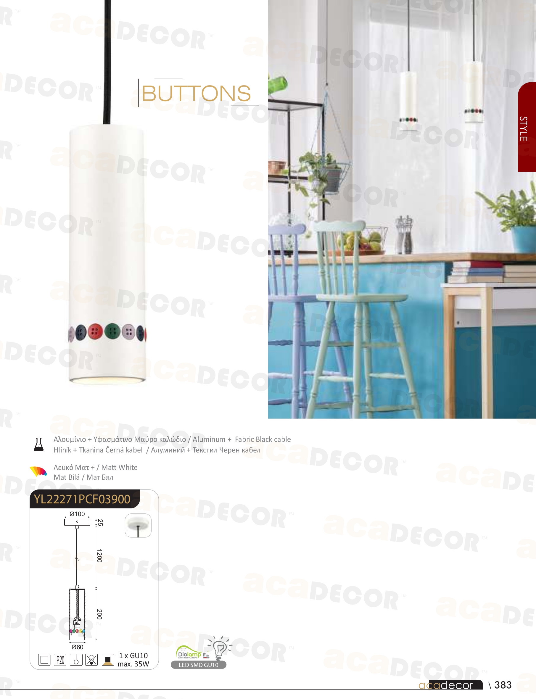 Осветителното тяло YL22271PCF ще осигури комфорт и естетика във всяко помещение, в което се постави. Цялостната визия и дизайн на лампата и вложените в изработката й материали, като алуминий в матово бял цвят, кабел с черна текстилна оплетка, ще допринесат за един неповторим стил. Благодарение на дългогодишния опит, качествените материали и строгия контрол на качеството на изработка на производителя ACA-Lighting (Гърция), YL22271PCF е на високо европейско ниво.