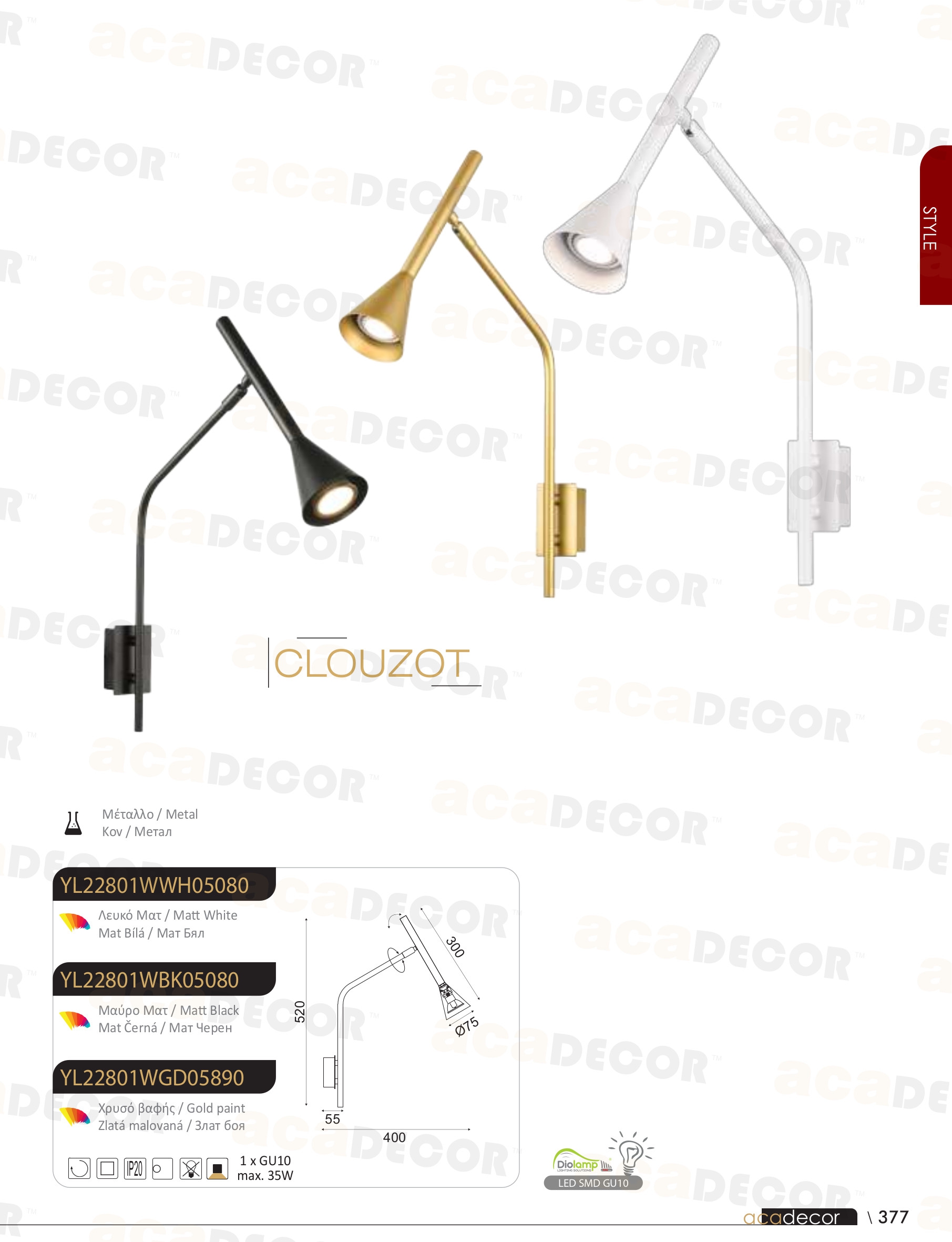 Осветителното тяло YL22801WGD ще осигури комфорт и естетика във всяко помещение, в което се постави. Цялостната визия и дизайн на лампата и вложените в изработката й материали, като метал в цвят злато, възможност за регулиране посоката на светене по две оси, ще допринесат за един неповторим стил. Благодарение на дългогодишния опит, качествените материали и строгия контрол на качеството на изработка на производителя ACA-Lighting (Гърция), YL22801WGD е на високо европейско ниво.