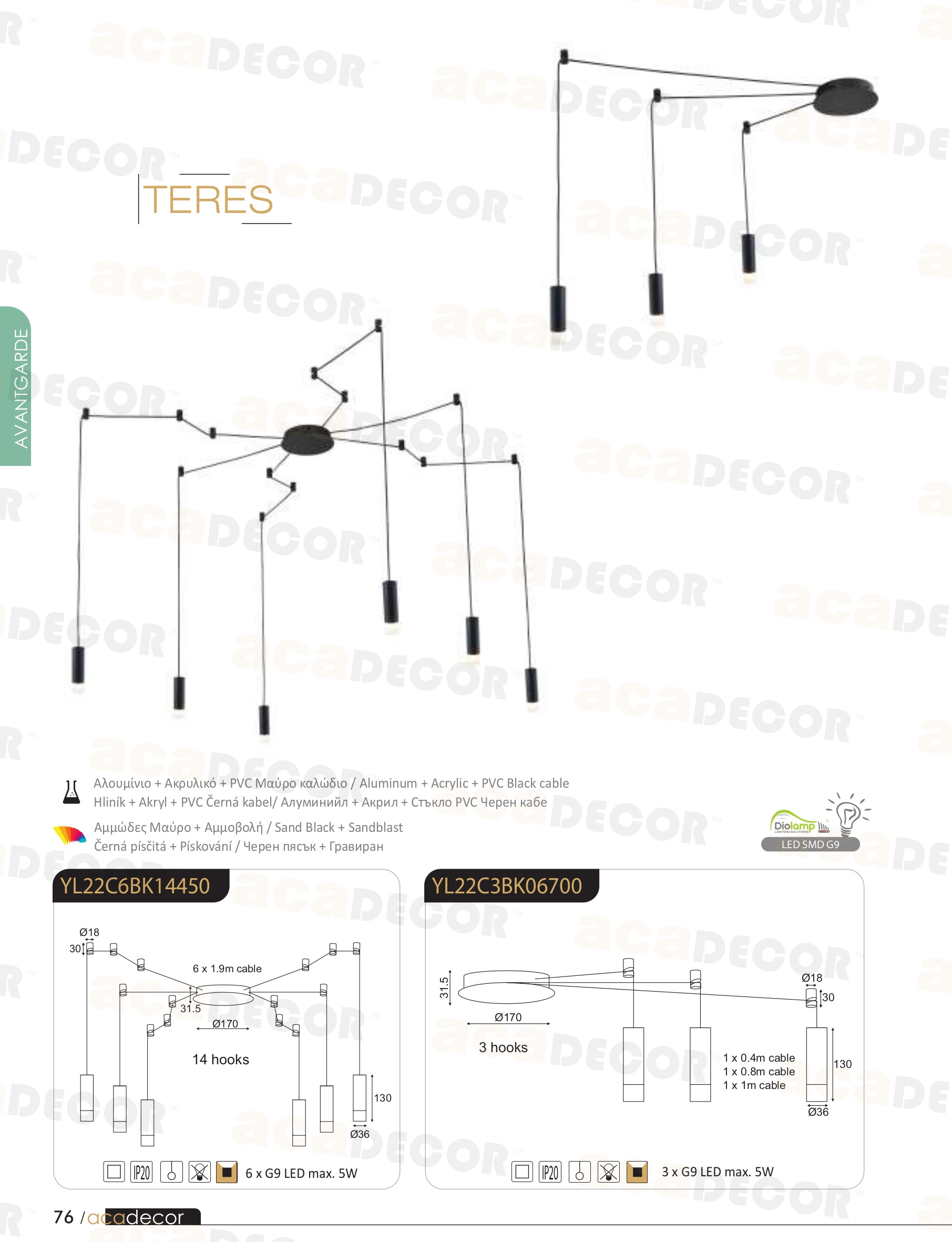 Осветителното тяло YL22C6BK ще осигури комфорт и естетика във всяко помещение, в което се постави. Цялостната визия и дизайн на лампата и вложените в изработката й материали, като алуминий в пясъчно черно, полимер в бяло, черен PVC кабел, 14 куки, ще допринесат за един неповторим стил. Благодарение на дългогодишния опит, качествените материали и строгия контрол на качеството на изработка на производителя ACA-Lighting (Гърция), YL22C6BK е на високо европейско ниво.