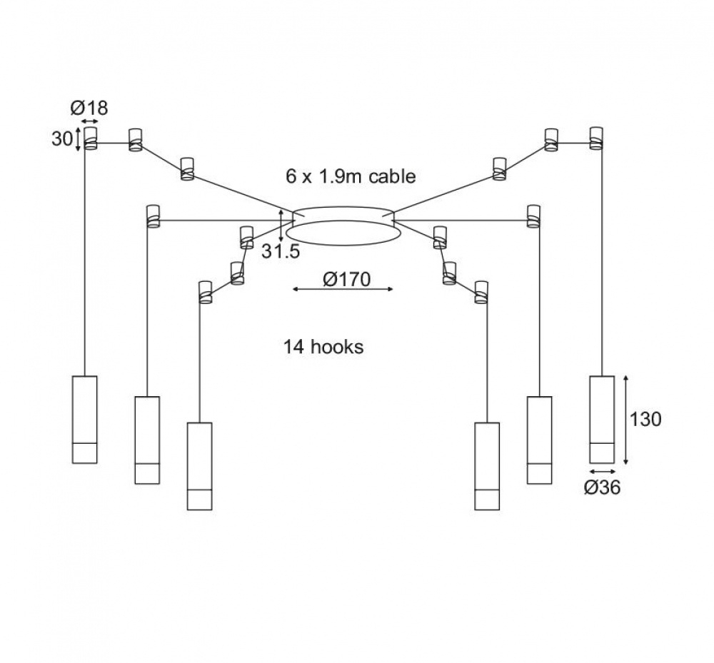 Ел. мощност 6 х 5 W Размери Ф71.1см x 1130см x Ф17см Производител ACA-Lighting, Гърция