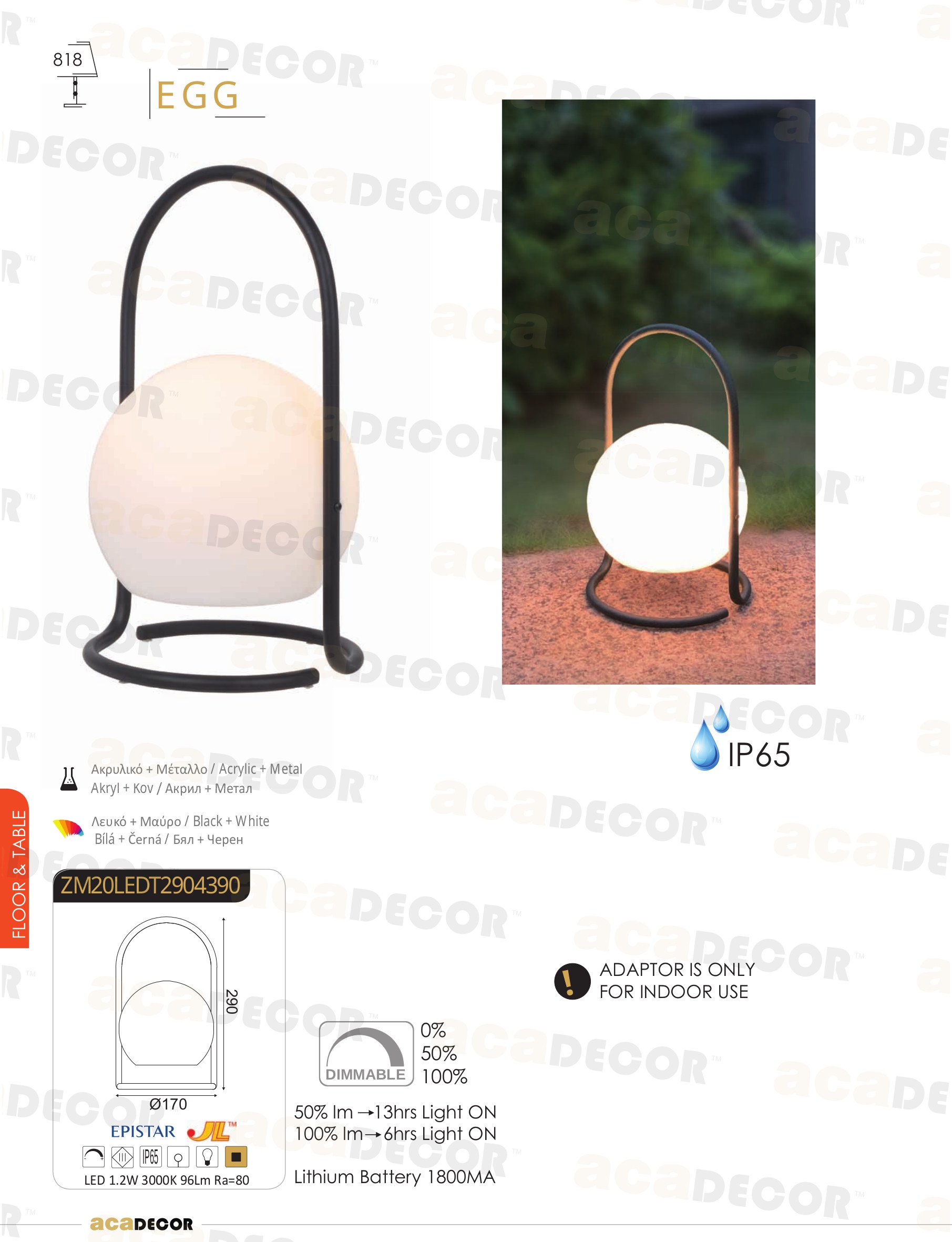Осветителното тяло ZM20LEDT29 ще осигури комфорт и естетика във всяко помещение, в което се постави. Цялостната визия и дизайн на лампата и вложените в изработката й материали, като полимер в млечно бяло, метал в черно, презареждаема литиева батерия 1800mA, ще допринесат за един неповторим стил. Благодарение на дългогодишния опит, качествените материали и строгия контрол на качеството на изработка на производителя ACA-Lighting (Гърция), ZM20LEDT29 е на високо европейско ниво.