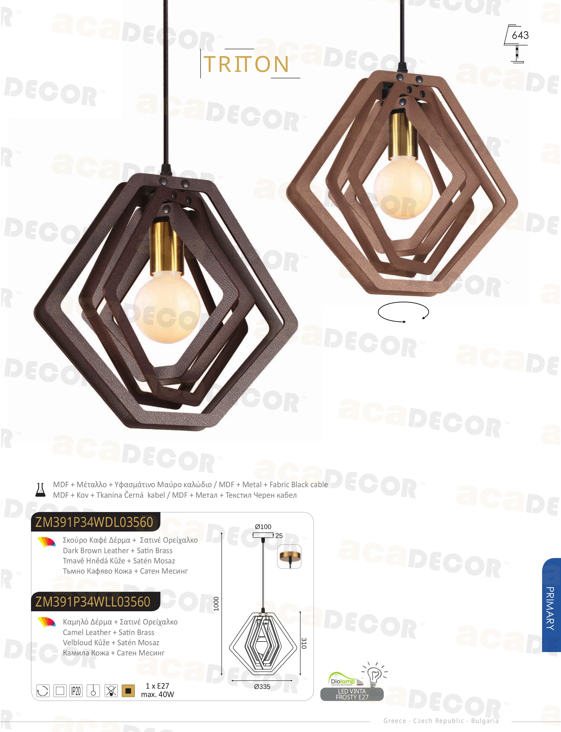 Стилът и естетиката на обстановката ще се обогатят благодарение, както на цялостната визия и дизайн на осветителното тяло, така и на вложените в изработката му, качествени материали, като: MDF в цвят тъмнокафява кожа, метал в цвят сатен месинг, кабел с черна текстилна оплетка.