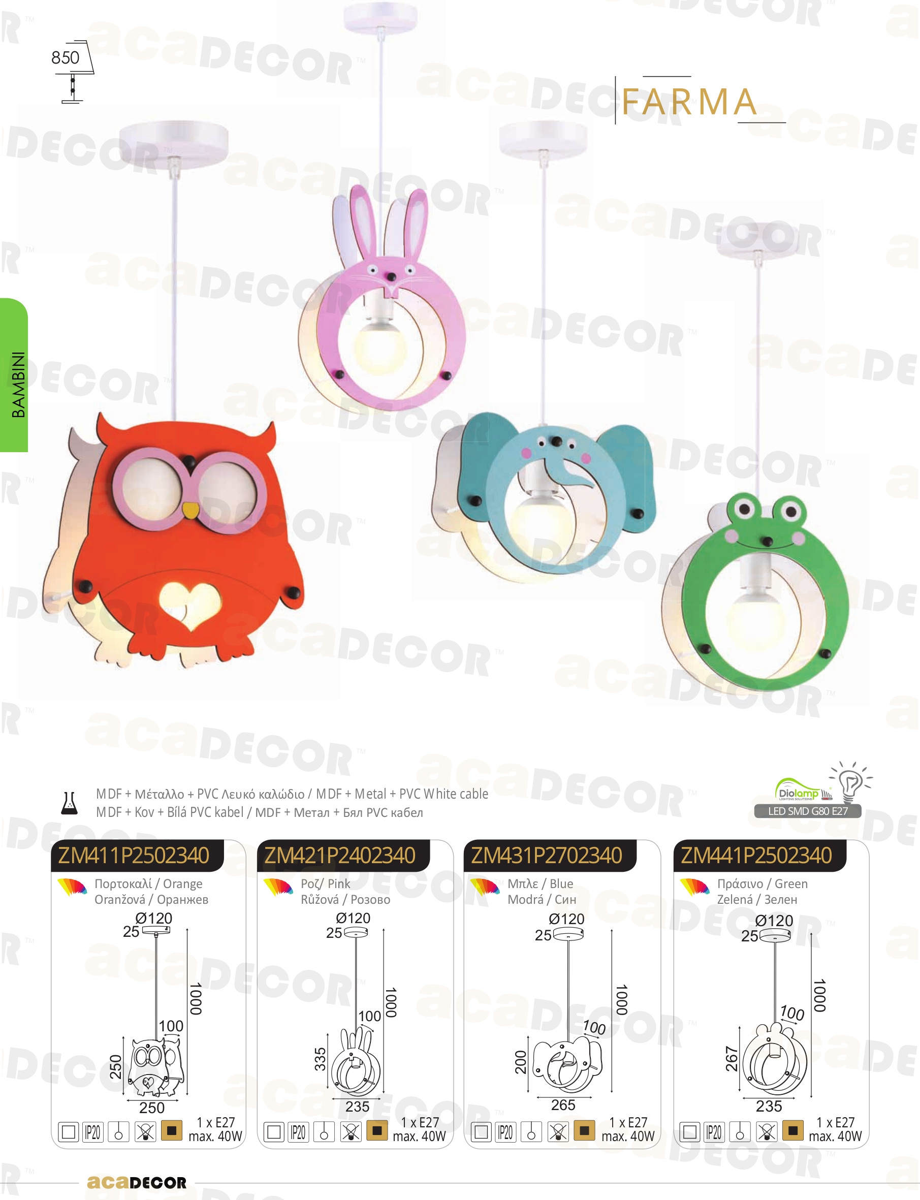 Осветителното тяло ZM411P25 ще осигури комфорт и естетика във всяко помещение, в което се постави. Цялостната визия и дизайн на лампата и вложените в изработката й материали, като MDF в оранжев цвят, метал в бяло, бял PVC кабел, ще допринесат за един неповторим стил. Благодарение на дългогодишния опит, качествените материали и строгия контрол на качеството на изработка на производителя ACA-Lighting (Гърция), ZM411P25 е на високо европейско ниво.